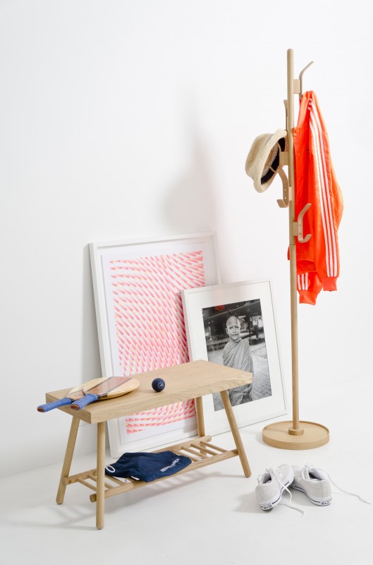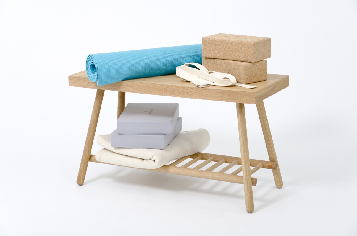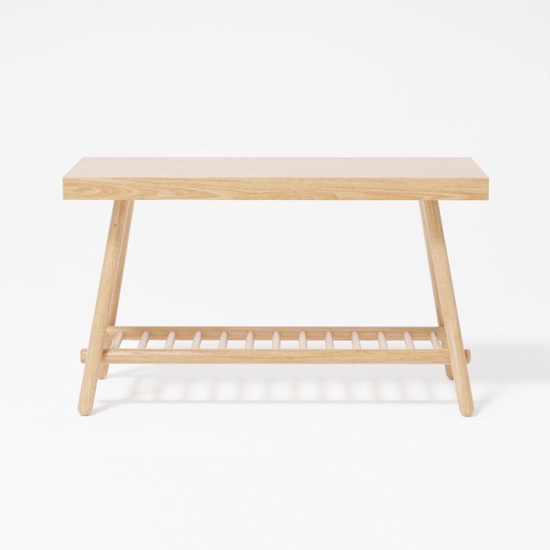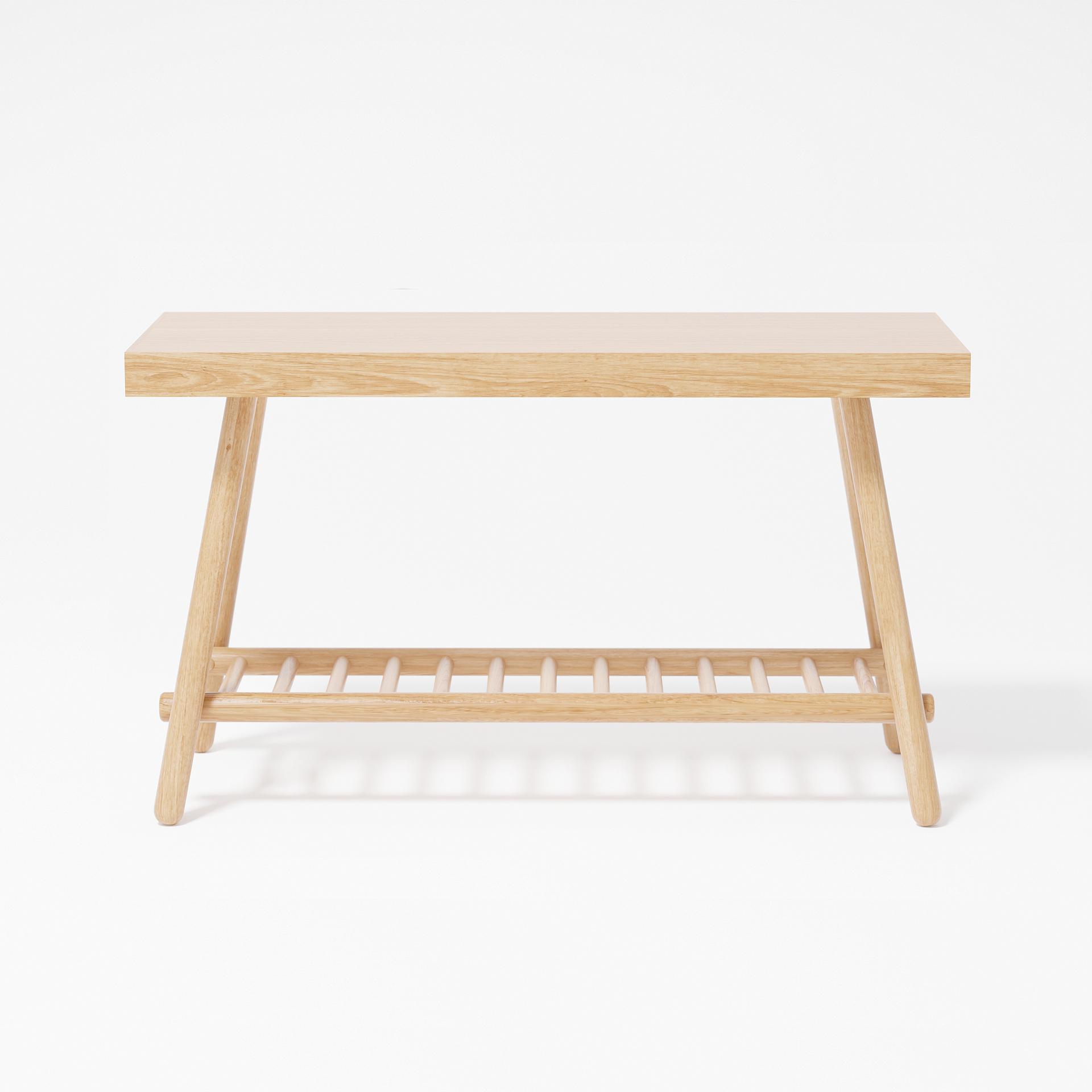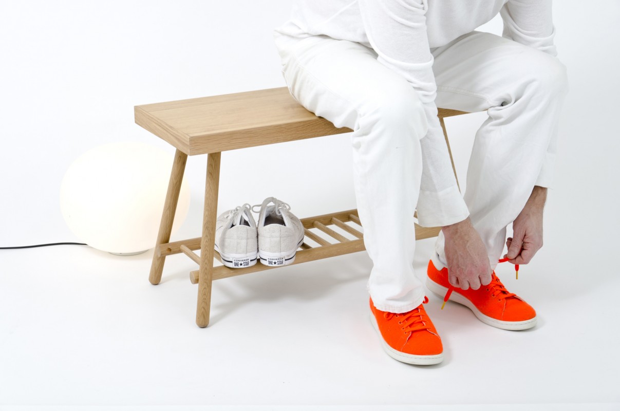 Bench 75 in a hallway is a place to take off shoes, put on boots, where outdoors and indoors meet. The storage shelf stores up to three pairs of shoes comfortably and there’s room underneath for more.