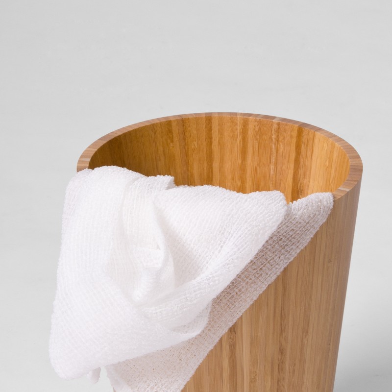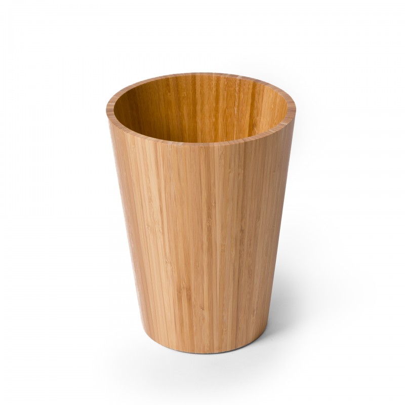 Individually assembled by hand, thin strips of bamboo are laminated together to form of this conical shape. A squared top and bottom edge cut a contemporary look. Perfect for use in a bathroom, bedroom or office. The surface can be easily cleaned inside and out with a soft damp cloth and soapy solution.