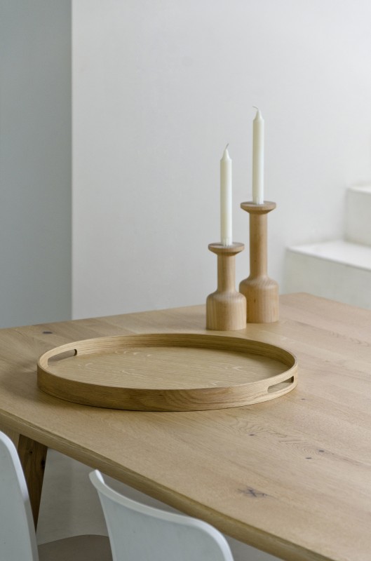 Busboy is made from sustainably harvested natural American white oak and oak veneers, selected for their warm colour, beautiful grain pattern and traditional hardwood durability. All edges look crisp but are carefully hand sanded to make them soft to the touch. Finished with a matt, water resistant lacquer. Design by Lincoln Rivers.