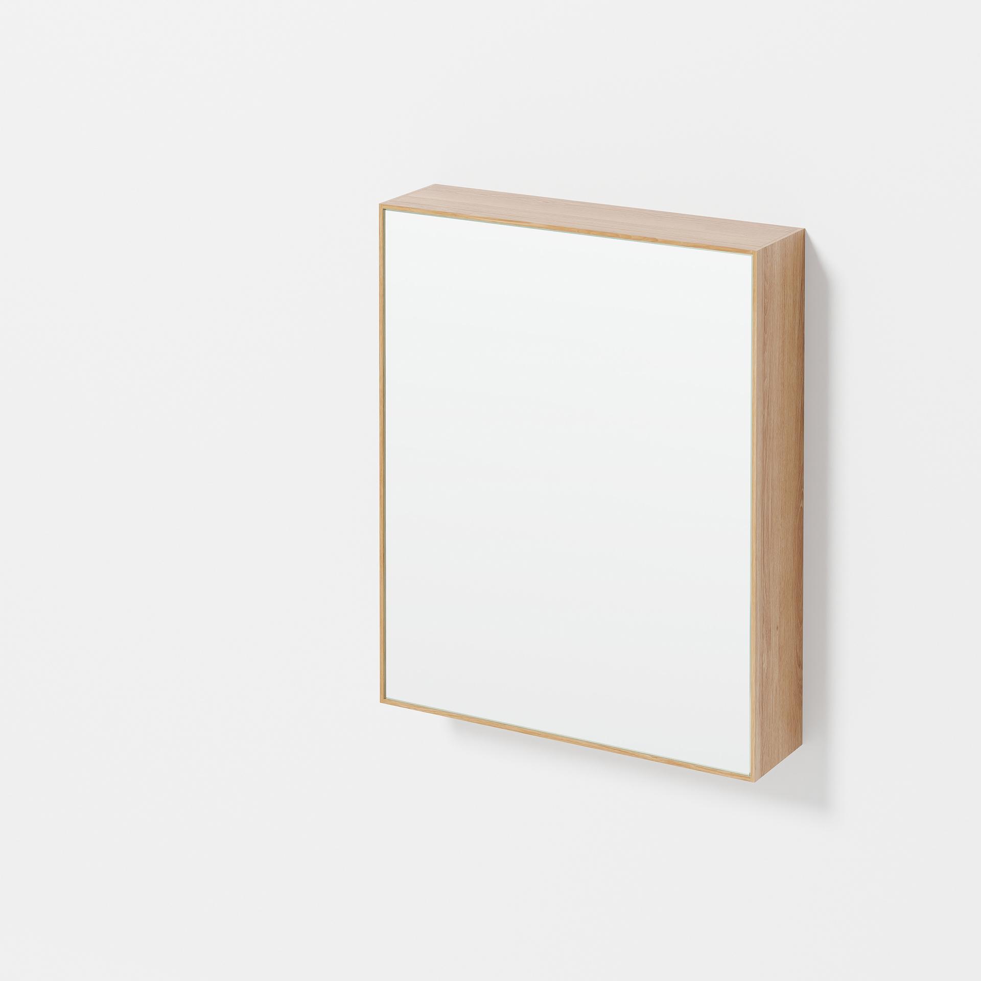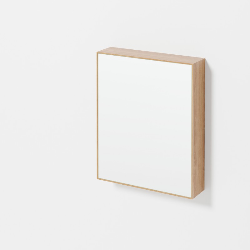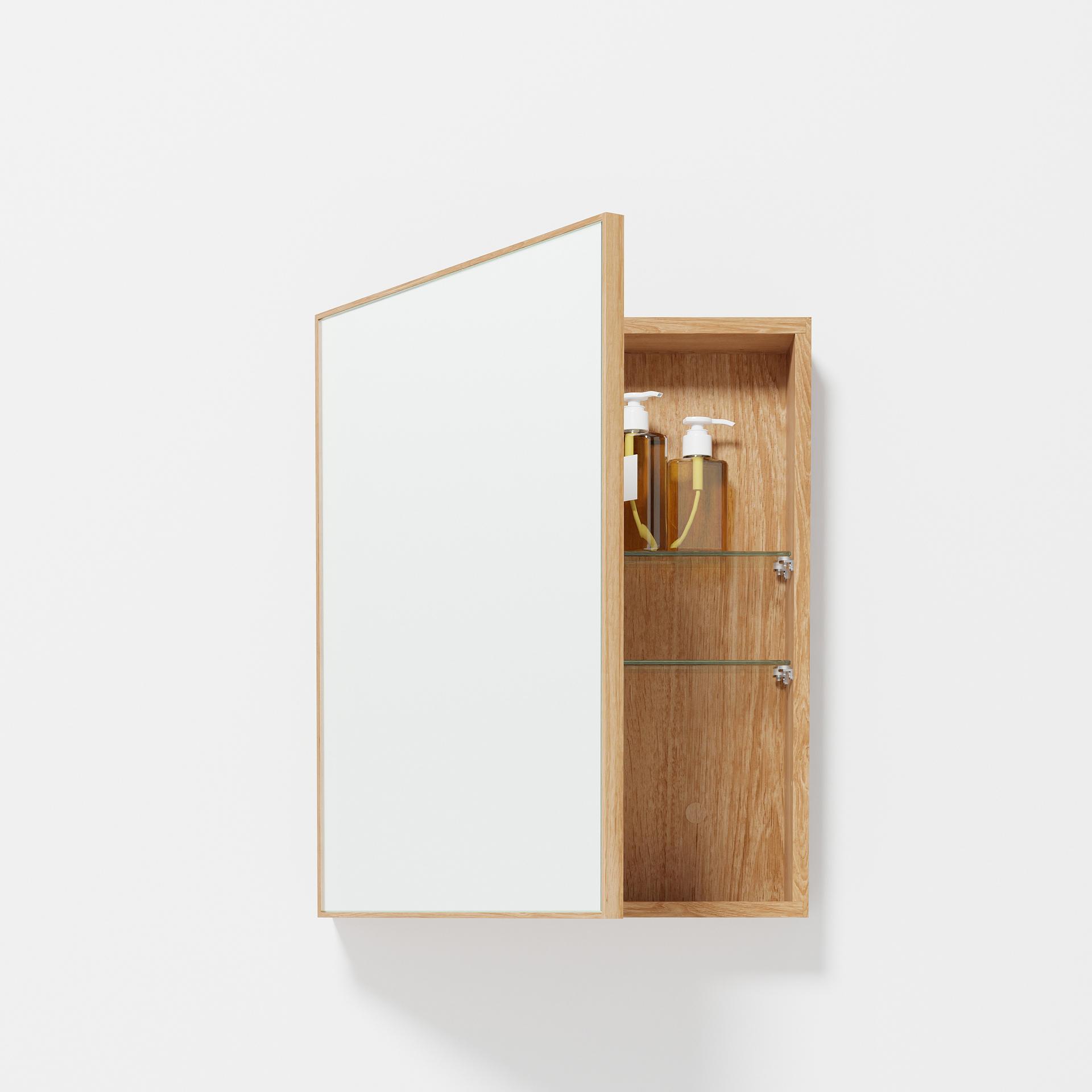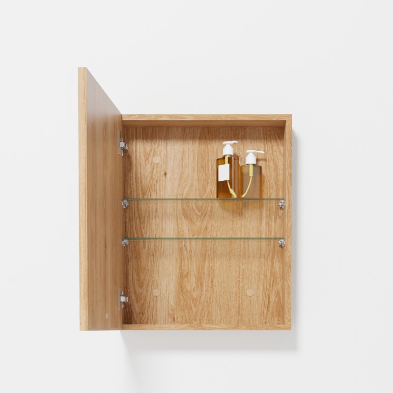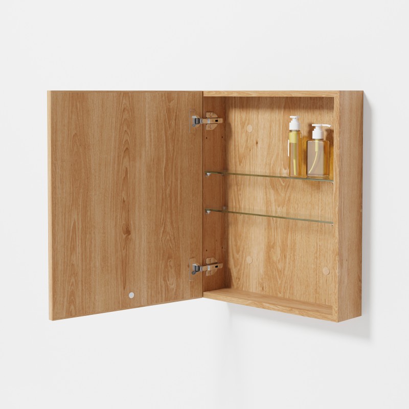 The single full mirror door gives a complete full face view and is framed with a flush oak beading edge. A slim profile means the cabinet does not stick out too far from the wall. The cabinet can be mounted for either left or right hand door opening, houses two adjustable emerald edged glass shelves and the door hinges soft close.