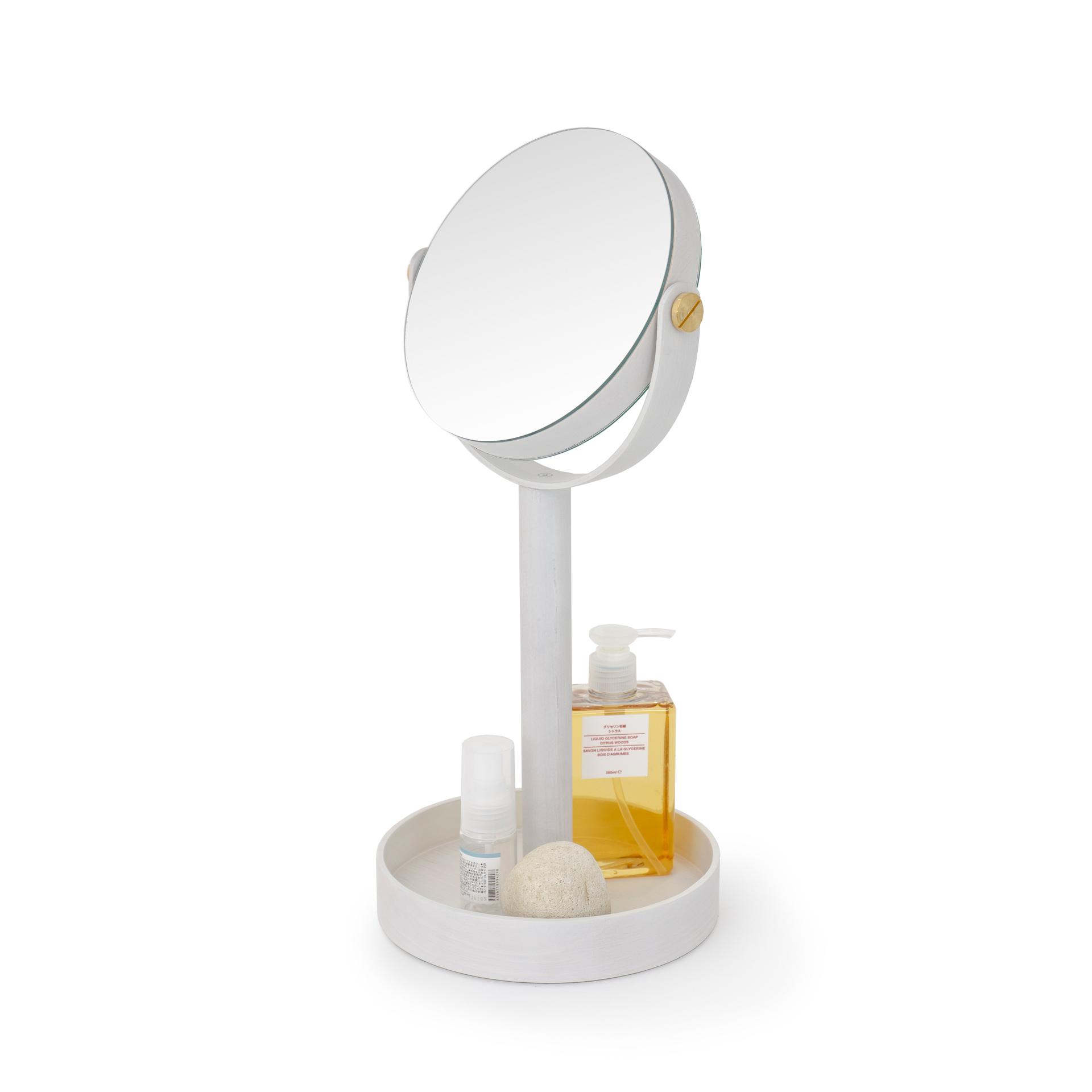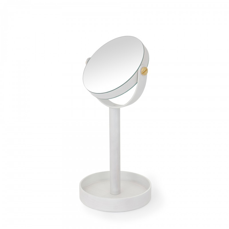 Close Up's pivoting magnifying mirror adjusts to the angle you desire. There's a choice of plain mirror on one side and a x5 magnification mirror on the other. The tall wood stand positions the mirror at a usable height; you won't have to hunch over. The round base is edged and can be used as a tray to hold your personal items like make-up, nail polish or contact lens cases, it's also very stable.