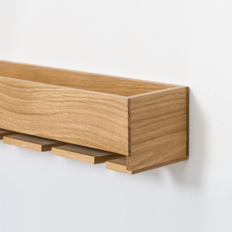 Cookhouse glass holder shelf stores up to six stem glasses safely and within easy reach. Glasses are stored upside down so the inside stays clean. Specially designed slots with wood edges prevent damage. Suitable for wine glasses, champagne flutes and cocktail glasses.