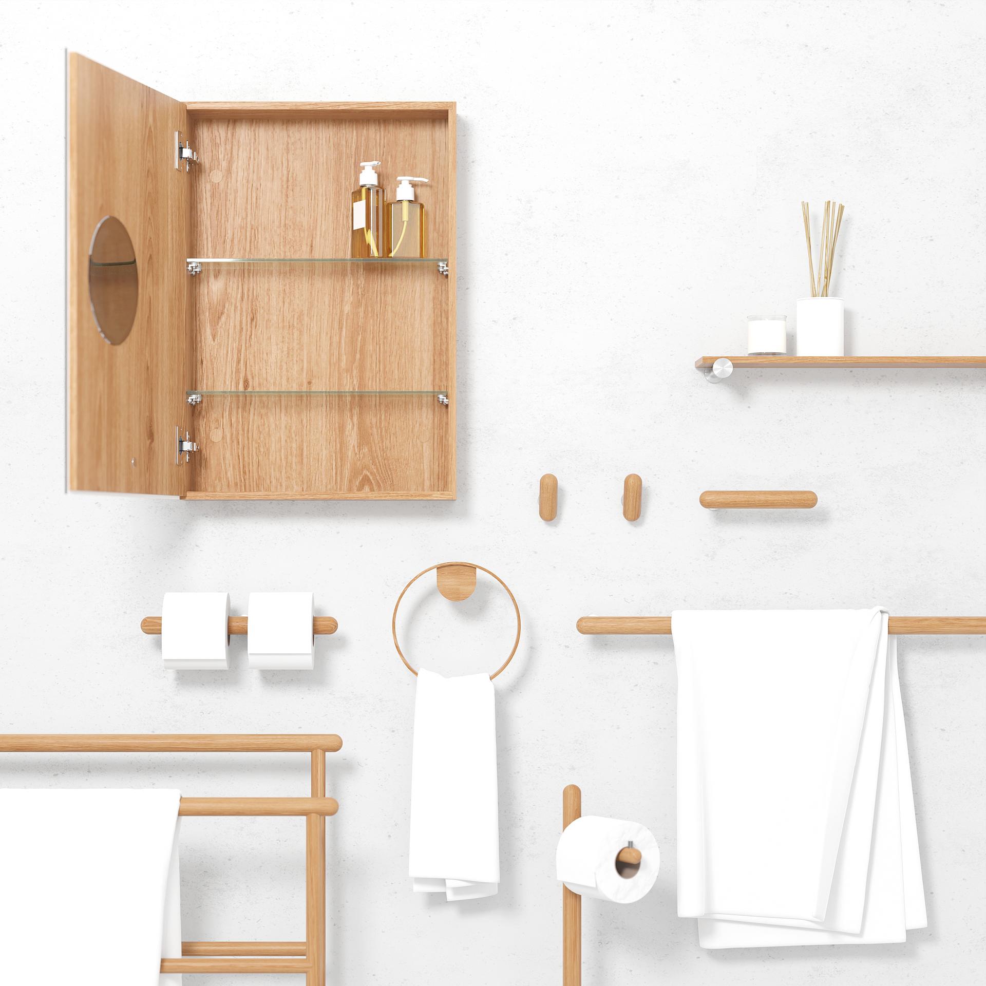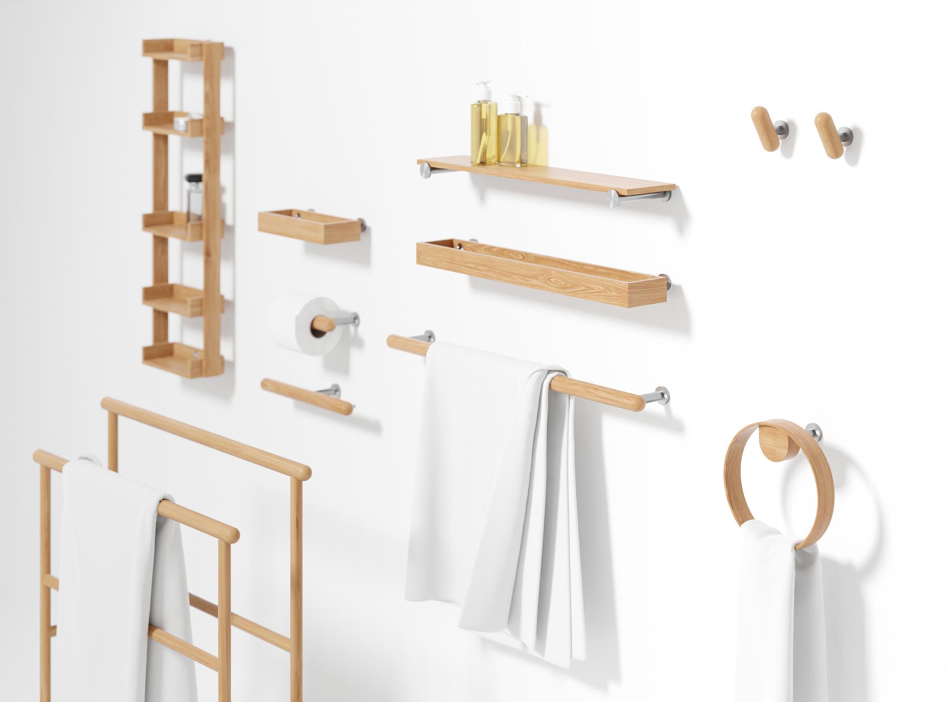 ‘Yoku’ - meaning bath in Japanese is a refined collection of bathroom furniture and wall fittings. The rounded, smooth wood parts integrate perfectly with the precision engineered, matt stainless steel fittings.