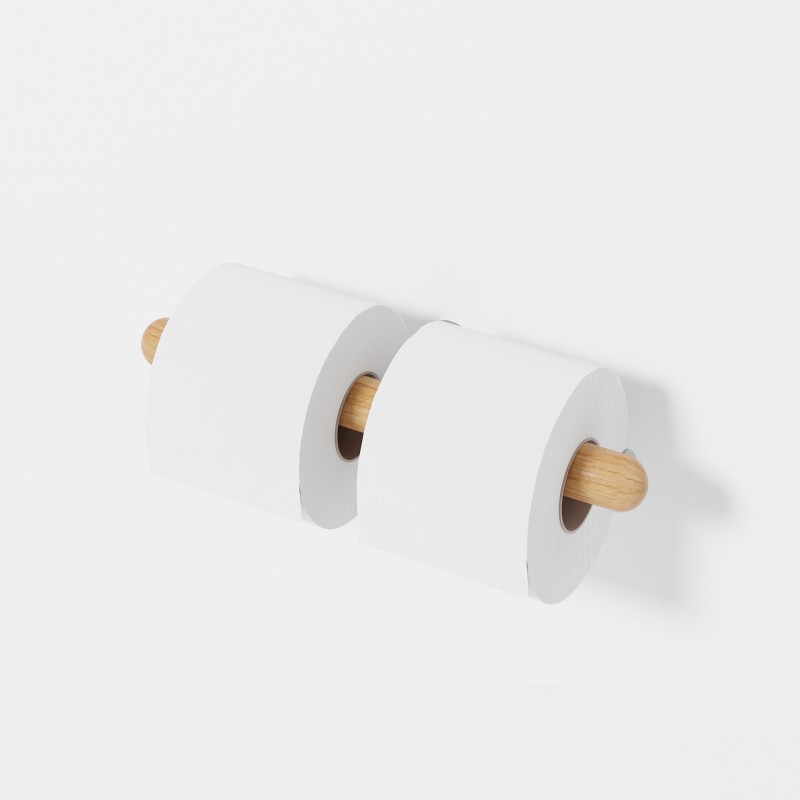 Yoku double toilet roll holder has additional capacity. It also features stainless steel studs that prevent rolls from falling off during use and makes replacing them easy.
