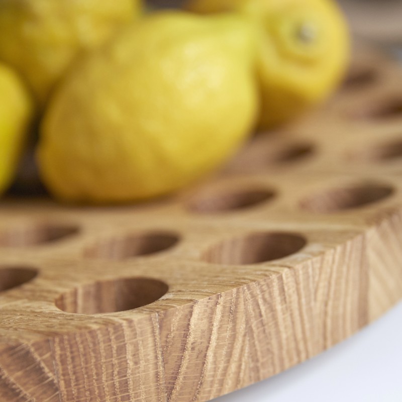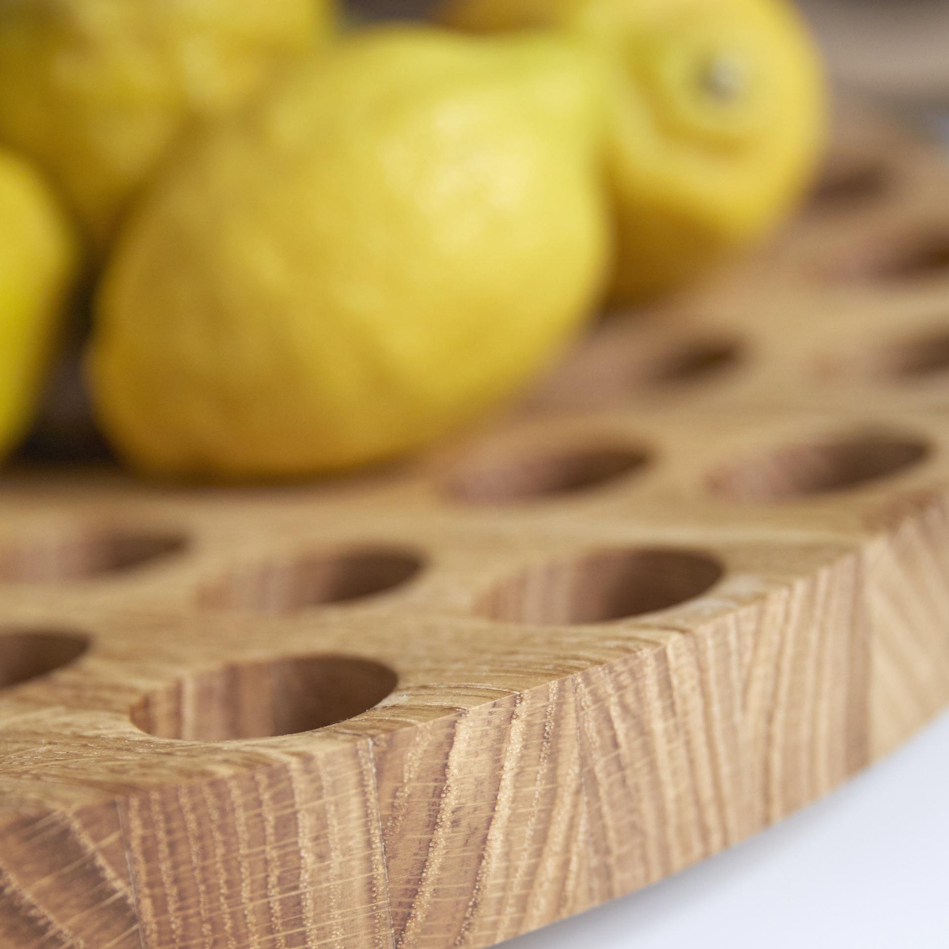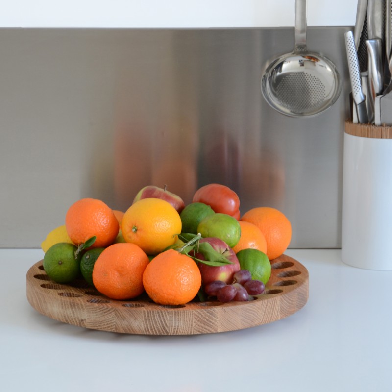 The gently rounded base elevates the edges of the bowl lightening the appearance and allowing it to be turned. The random pattern of holes establishes a dynamic to excite the eye. Circulation of air is promoted by the open structure, keeping fruit fresher for longer.