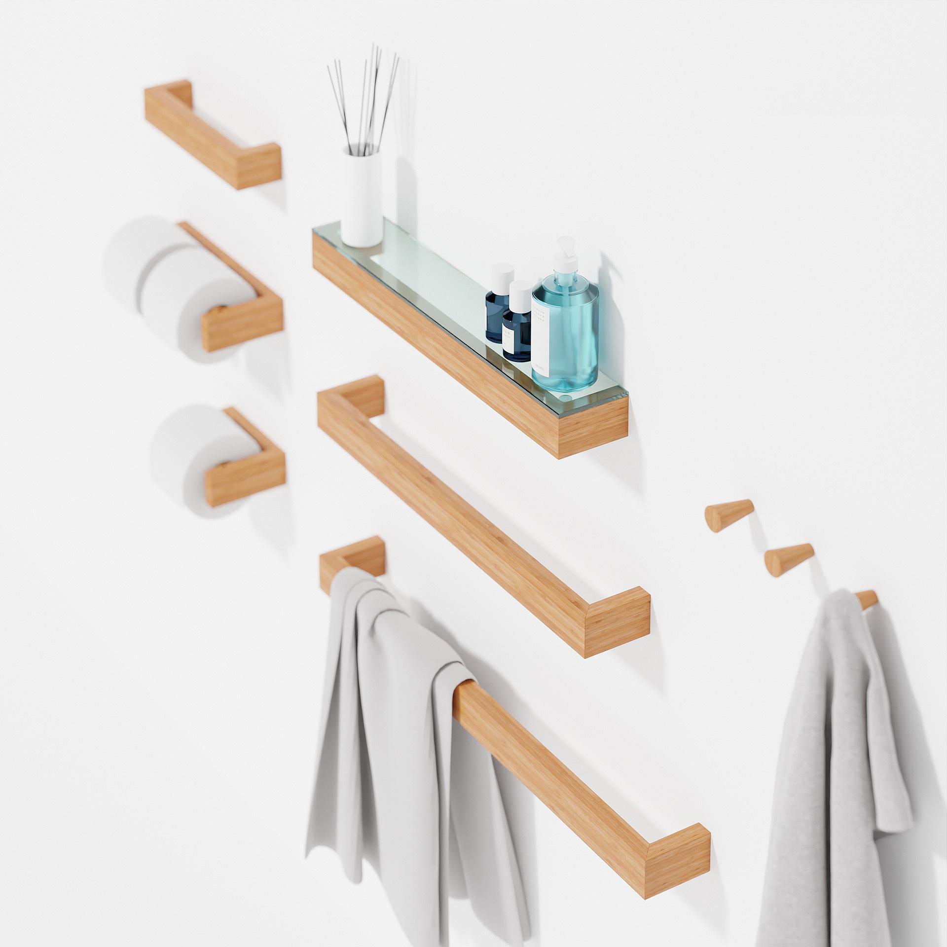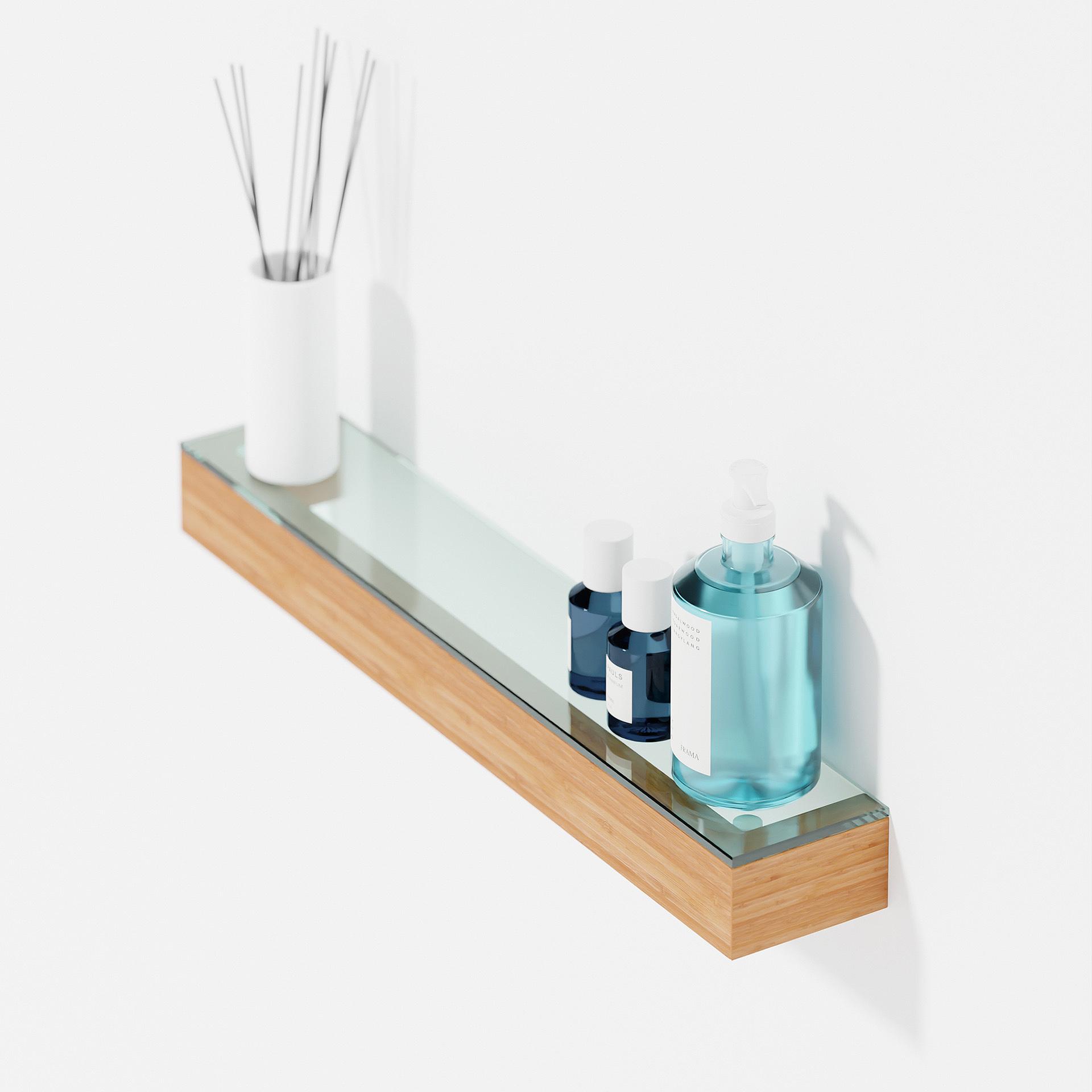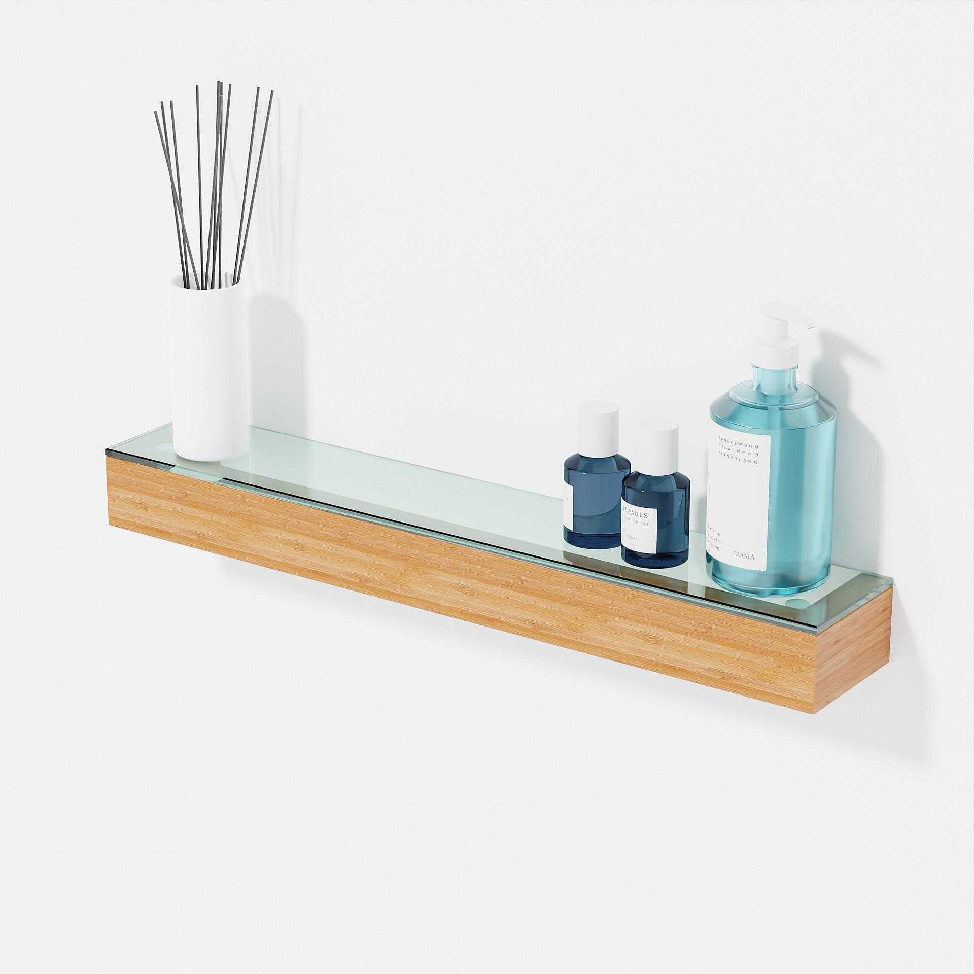 Polished, emerald edged glass contrasts beautifully with the engineered bamboo. The glass shelf lies flush with the bamboo edge. No visible fixings give this a an elegant minimalist Use to display prized perfumes or simply to keep close to hand the things you use most often.