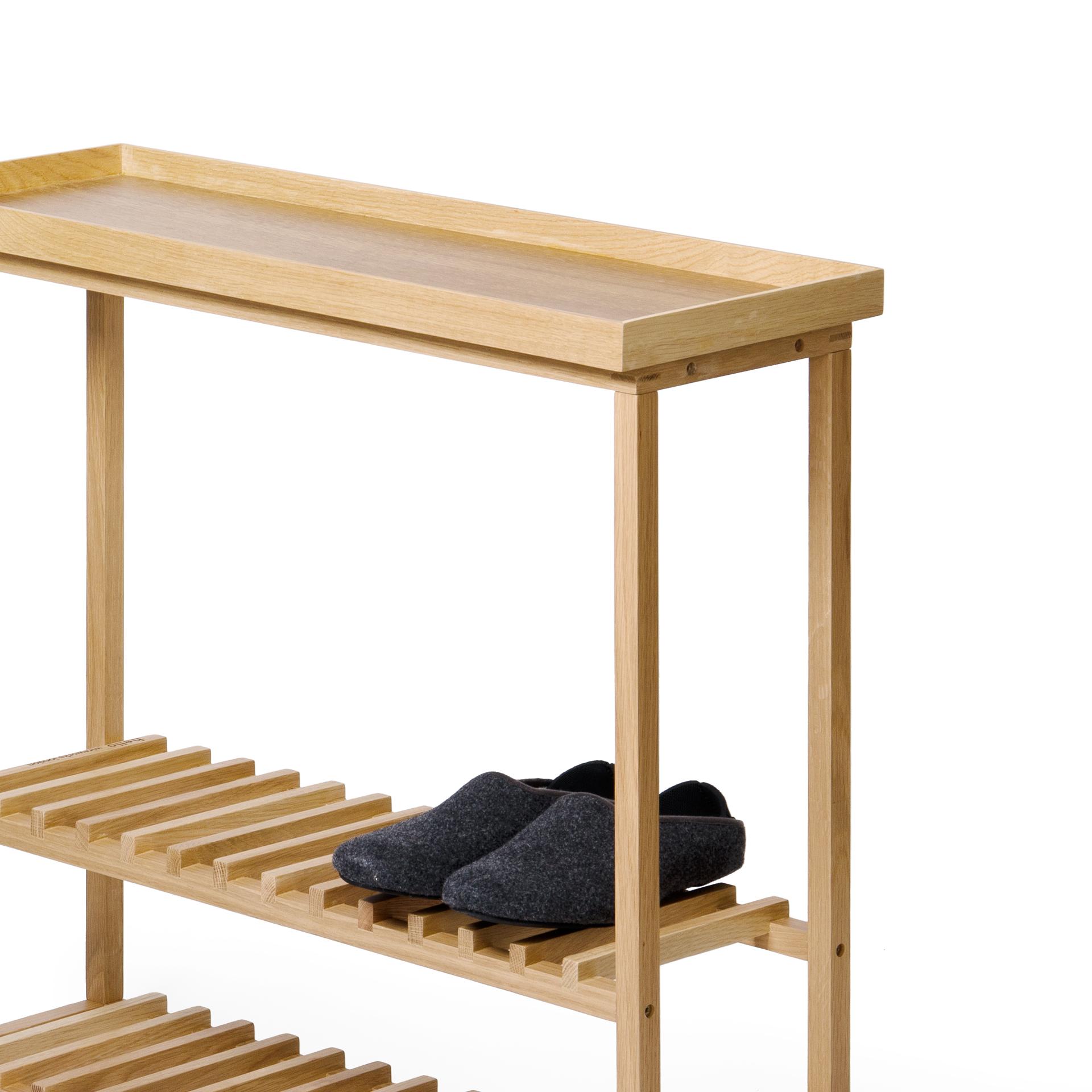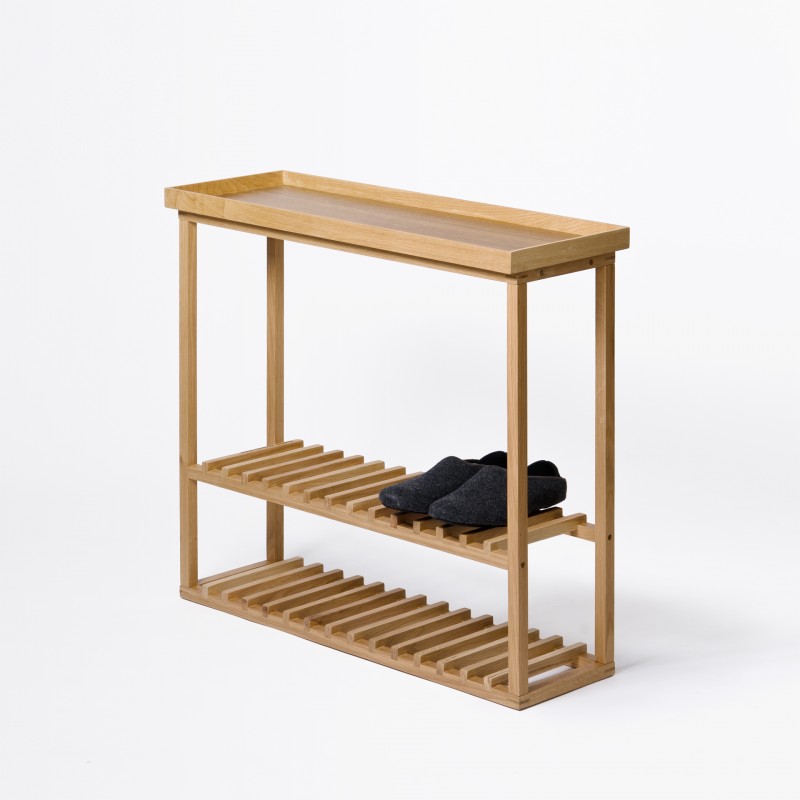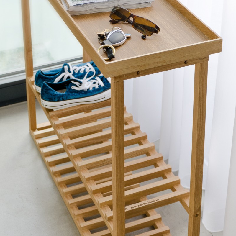 Hello storage table will push flush against a wall, the slim profile will not block a hallway. It has two slatted shelves for footwear and will store both shoes and tall boots. The top surface has a lipped edge to stop things falling off and is perfect for keys, mail, gloves or sunglasses.