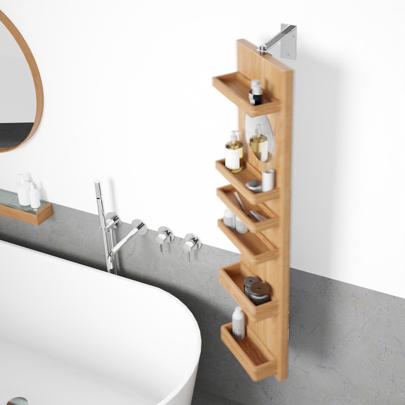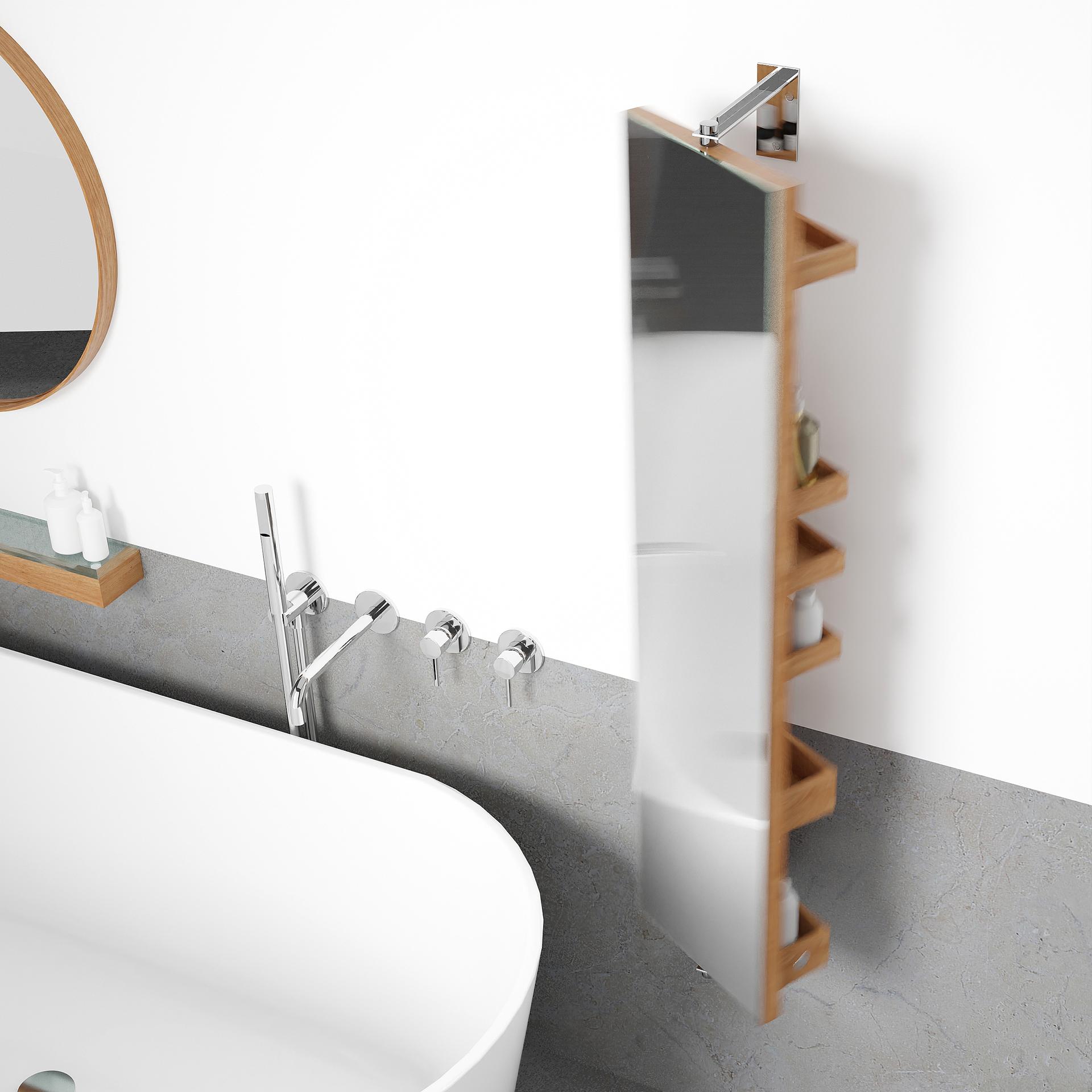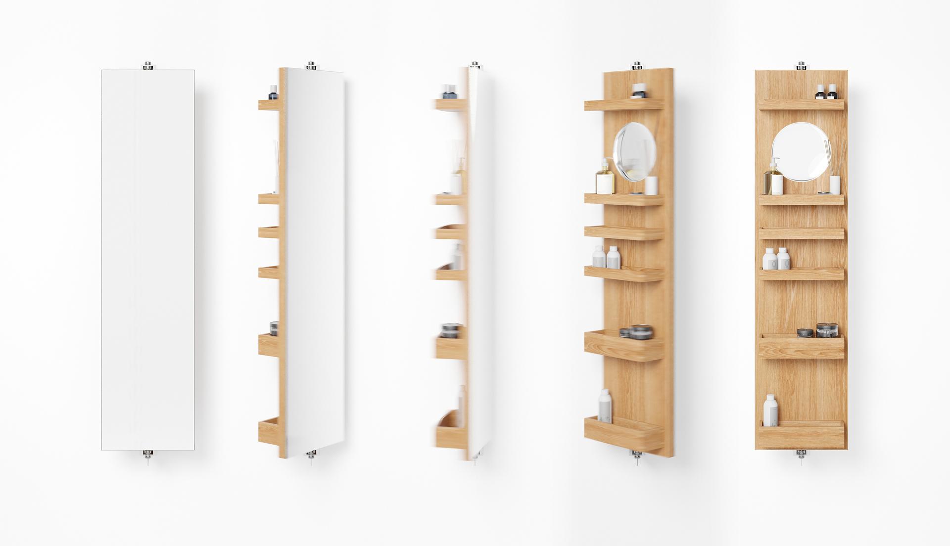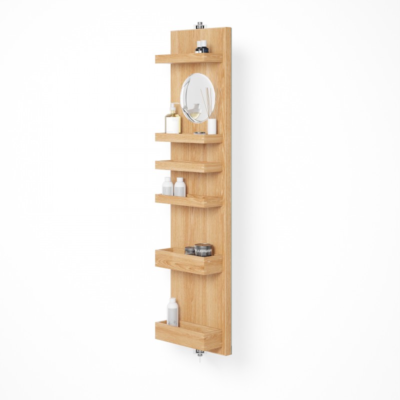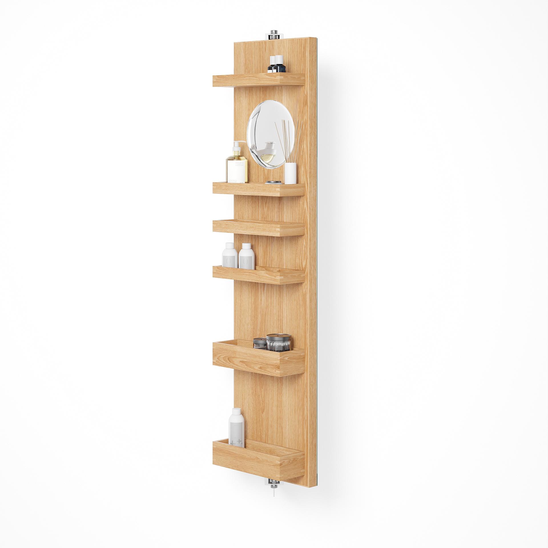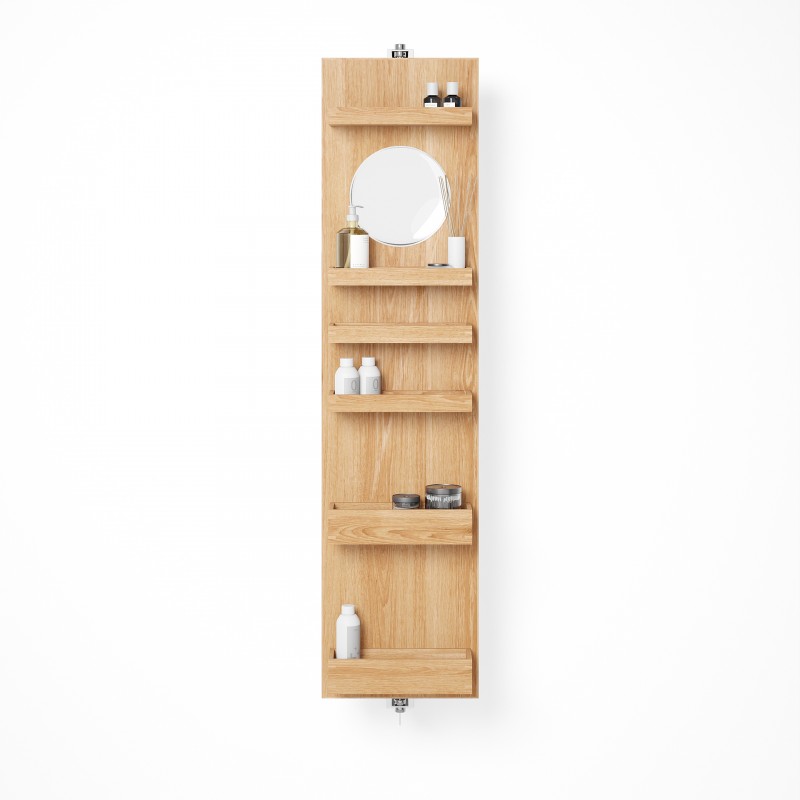 Cosmos revolve 1140 combines a number of desirable features in one highly evolved design. On one side is a full length dressing mirror (1140 x 280mm). On the other side, a round times five magnifying mirror (183mm diameter) gives a very close-up view. There are also six lipped edge storage trays for creams, bottles and lotions. The storage trays are staggered to provide efficient storage. Slim trays at the top are perfect for storing jars, lipsticks and pencils. Deep trays lower down are ideal for taller bottles and containers. Polished stainless steel wall brackets provide a secure fixing and the cabinet rotates easily making access effortless.
