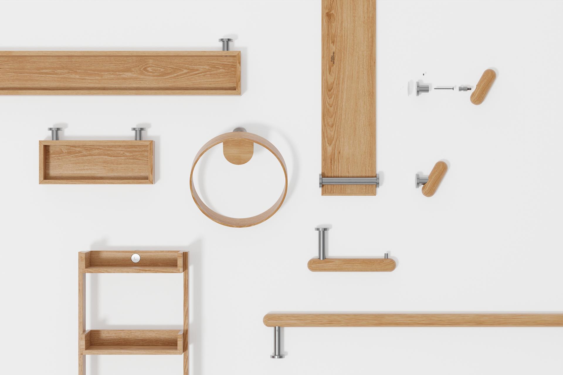 ‘Yoku’ - meaning bath in Japanese is a refined collection of bathroom furniture and wall fittings. The rounded, smooth wood parts compliment perfectly the precision engineered, matt stainless steel fixings.