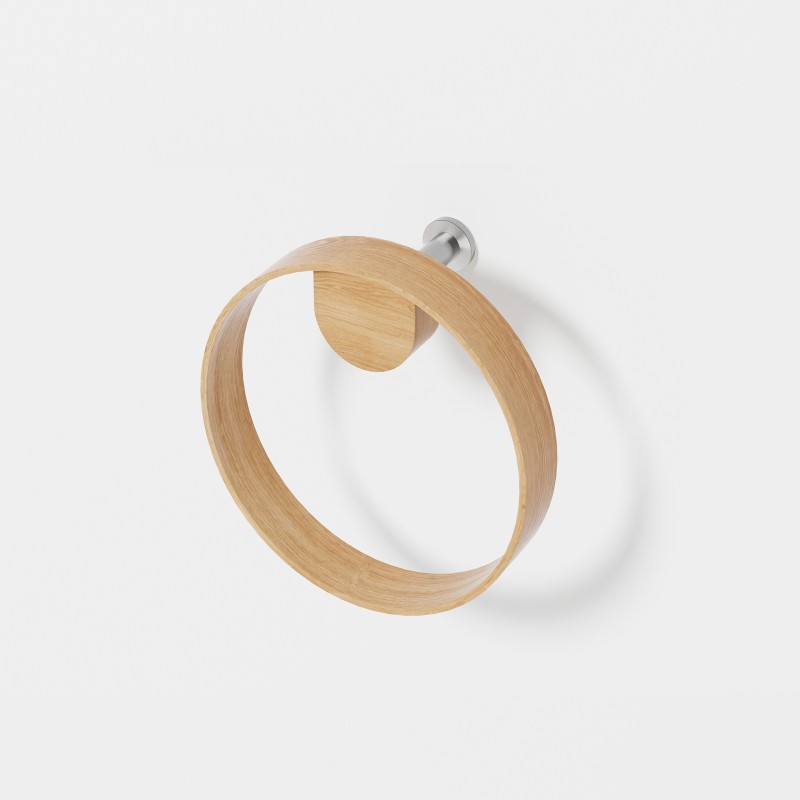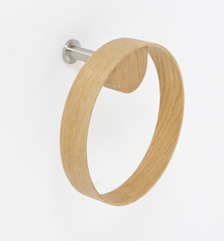 Yoku ring towel holder presents the hand towel elegantly away from the wall and allows space for air to circulate freely. The continuous loop holds towels securely.
