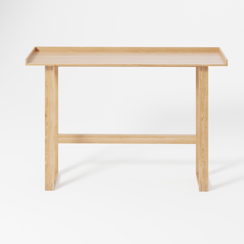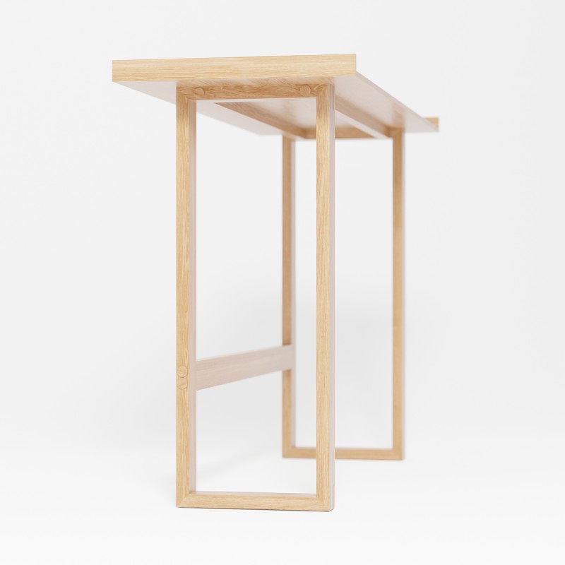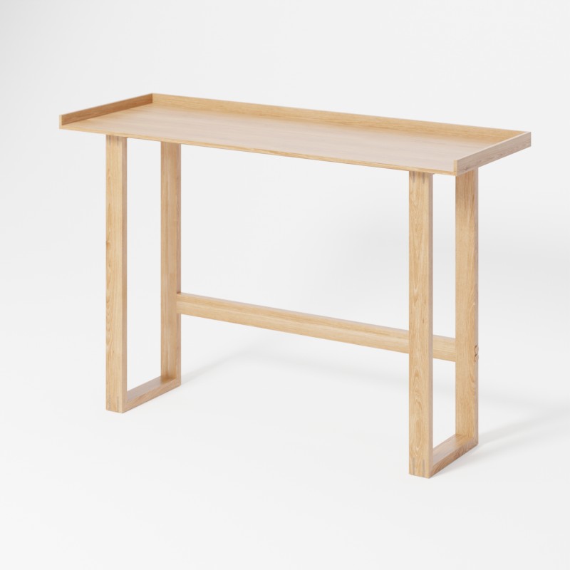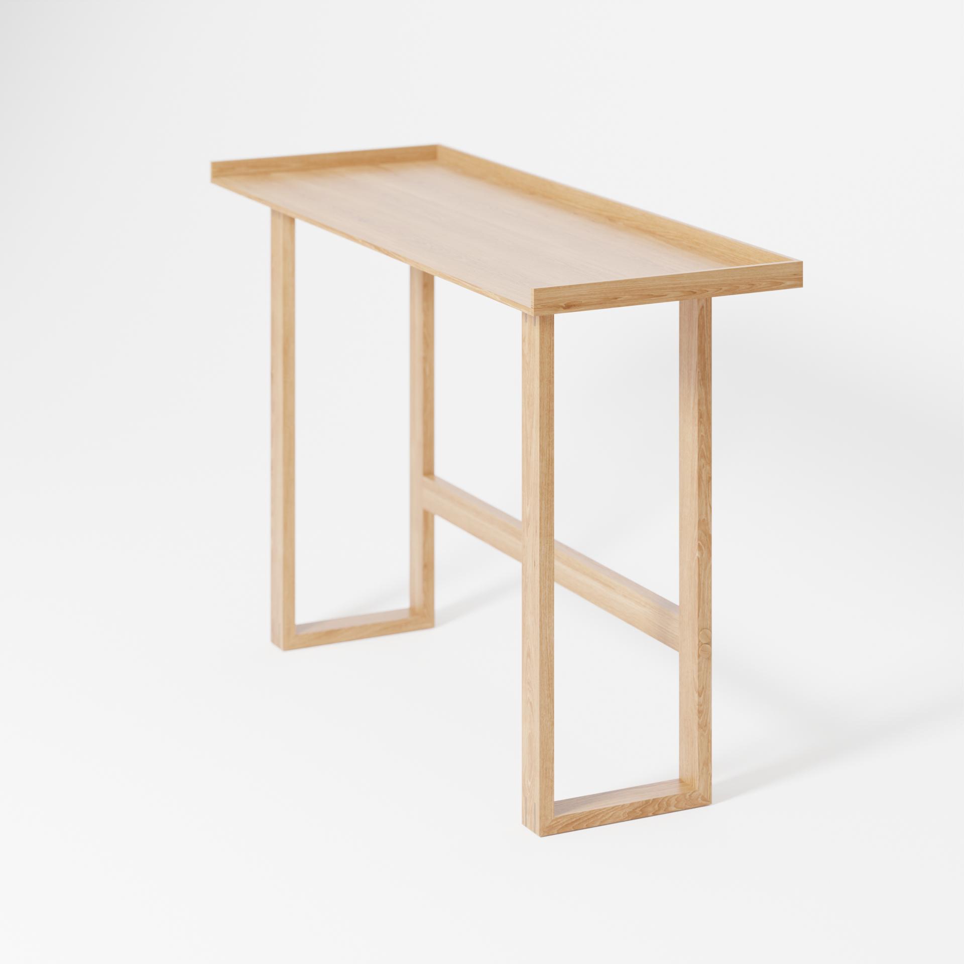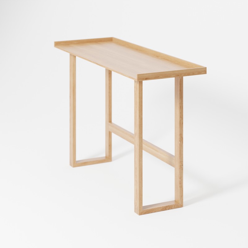 The slim dimensions allow it to be placed in various places and spaces. The lipped edge on three sides stops things falling off. Solid oak supported legs provide a stable, rigid construction. Maximum recommended load 10kg.