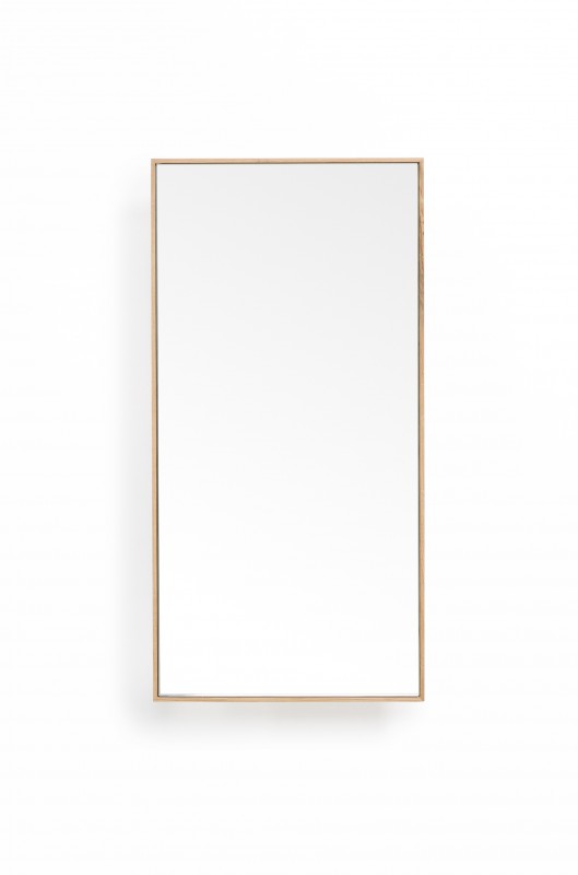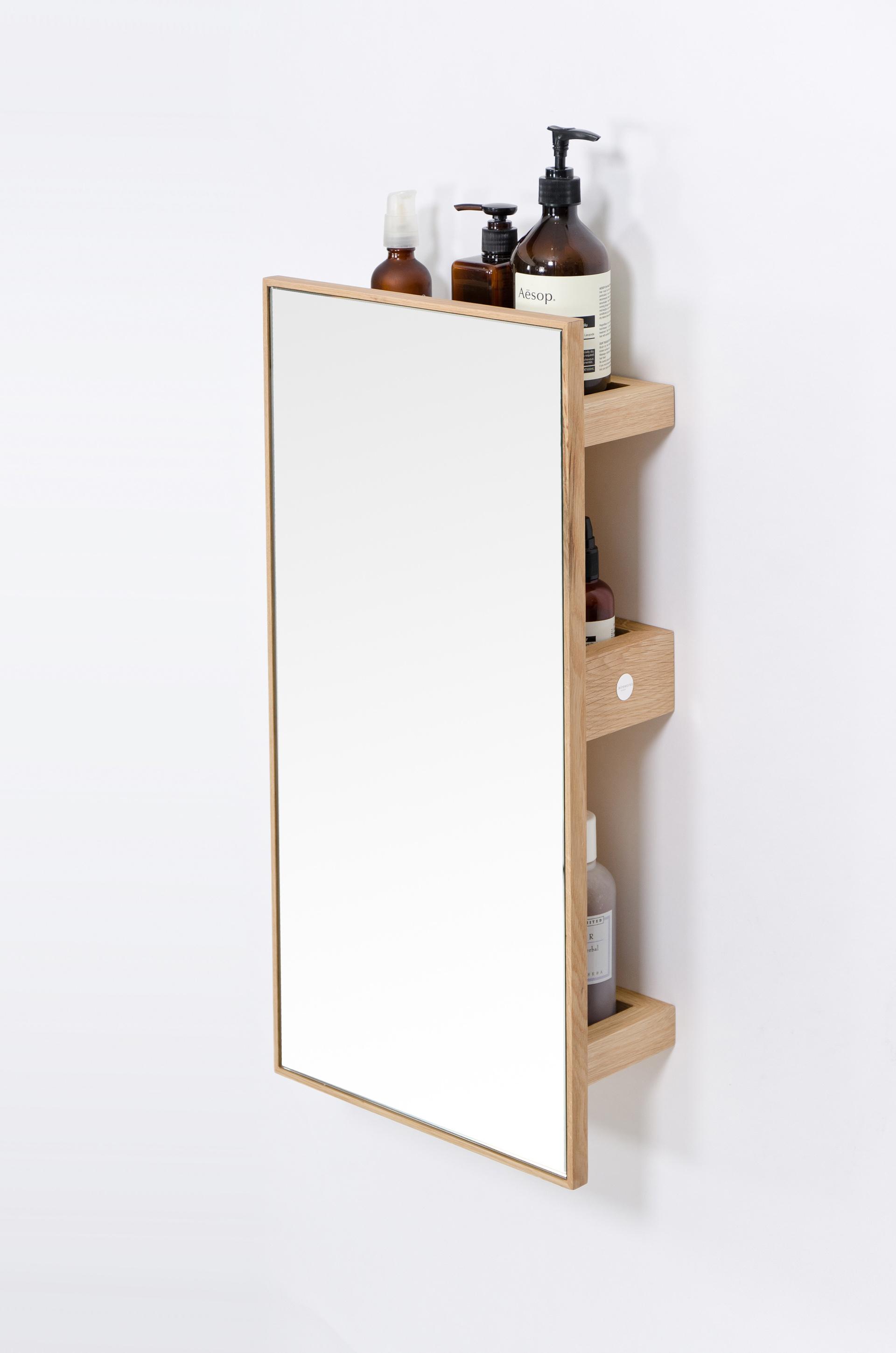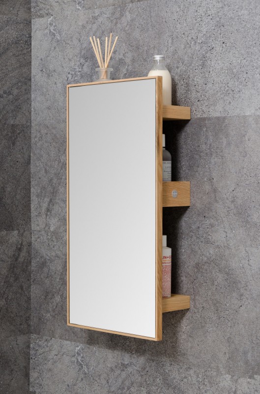 Three tray mirror doubles as both a functional wall mirror and clever wall hanging storage unit. The oak structure has three lipped edge trays tucked behind a glass mirror. The lipped edges stop things falling off.